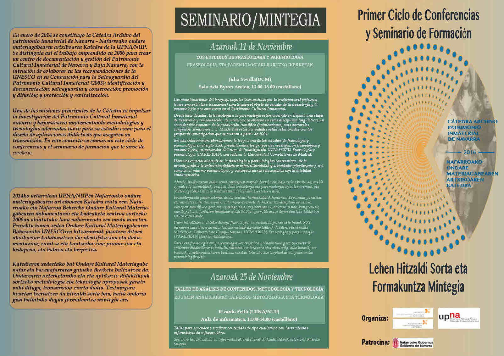 Katedraren xedeetako bat Ondare Kultural Materiagabe nafar eta baxenafarraren gaineko ikerketa bultzatzea da. Ondarearen azterketarako eta eta aplikazio didaktikoak sortzeko metodologia eta teknologia aproposak garatu nahi ditugu, transmisioa ziurta dadin. Testuinguru honetan txertatzen da hitzaldi sorta hau, baita ondorio gisa baliatuko dugun formakuntza mintegia ere.